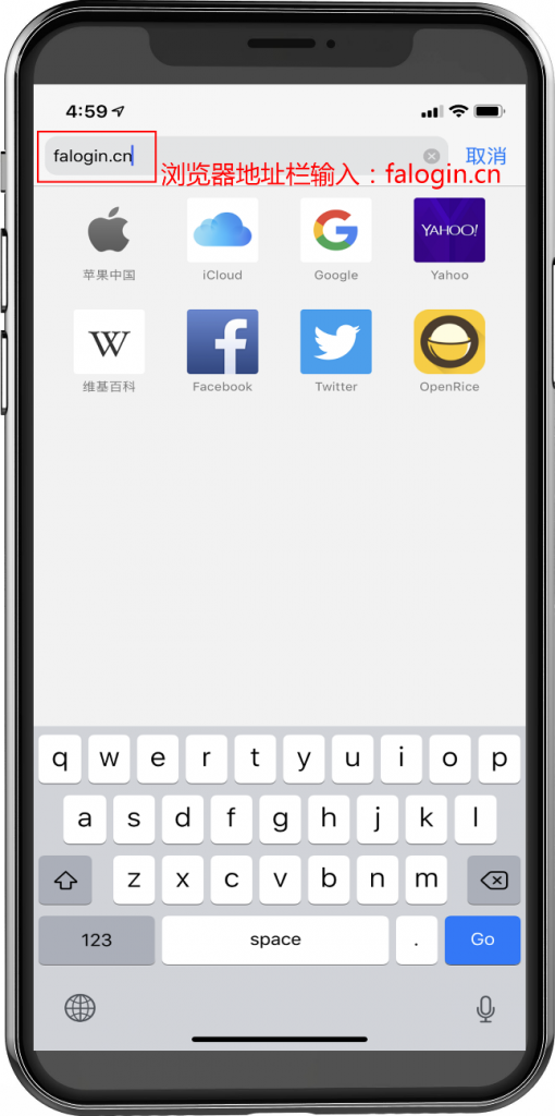如果你的手机成功的链接到了无线信号之后,那么手机会自动弹出路由器的登录界面如果没有弹出让我们那么我们就在浏览器地址栏中手动的输入路由器的地址 falogin.cn
